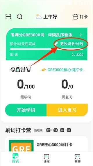 1、下载并打开GRE3000词app,选择“更改词书/计划”选项;