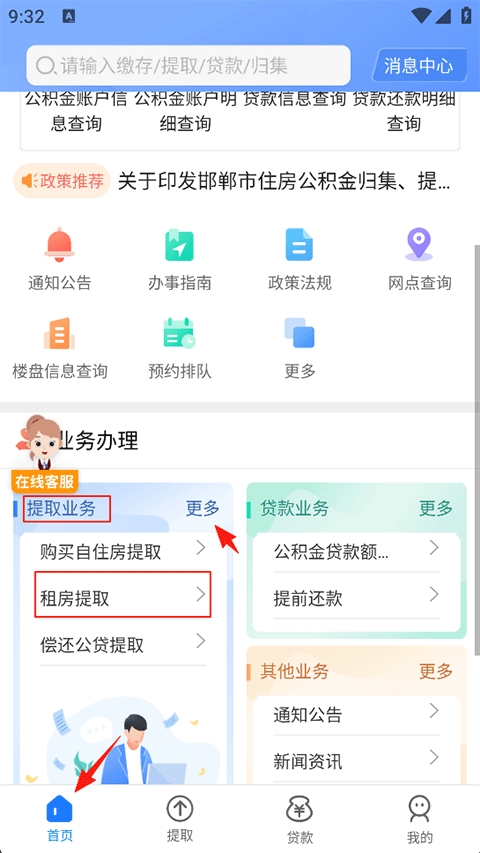 1、打开邯郸公积金APP,选择主页面“业务办理”-“提取业务”-选择“租房提取”;