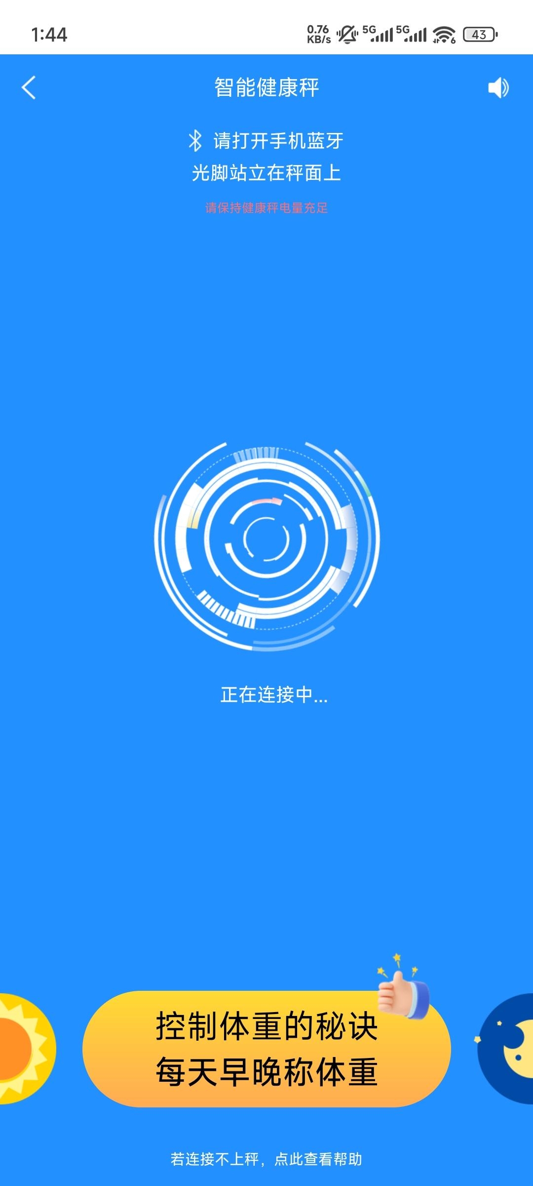 6、请打开手机蓝牙,光脚站立在秤面上连接成功后、开始智能分析