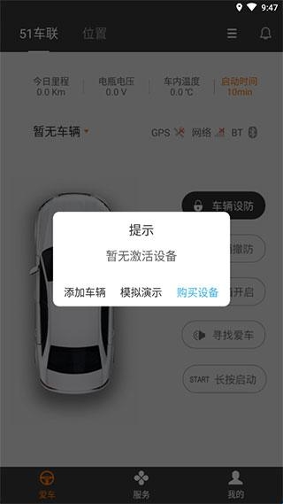 2、点击任意功能按钮会提示暂无激活设备,点击左下角的添加车辆按钮
