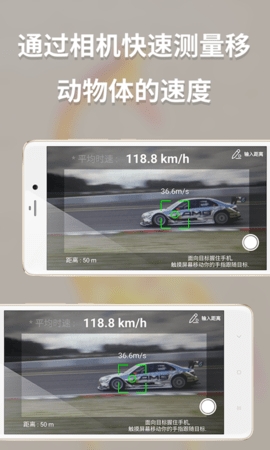 4.速度测量工具,一般是利用相机的成像原理,面向目标握住手机,触摸屏幕移动你的手指跟随目标。