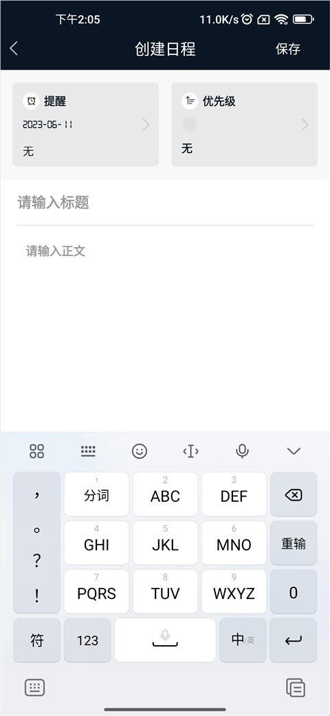 3、然后就可以创建日程了,输入标题和正文,并且设置提醒时间和优先级,最后点击保存即可。