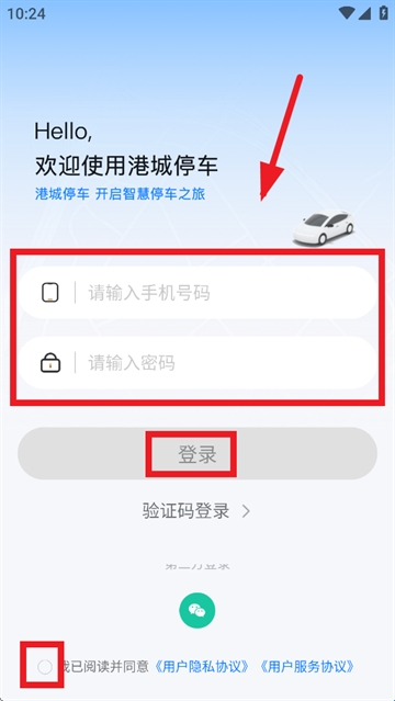 输入手机号,密码,勾选我已阅读并同意《用户隐私协议》《用户服务协议》,点击登录即可