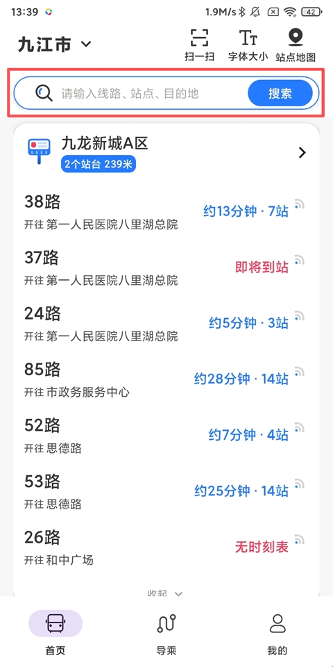 1、打开易公交APP,定位到您所在的城市,接着点击上方搜索栏搜索相关路线、站点或目的地;
