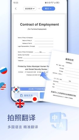 1、支持拍照翻译、文字翻译功能,一键翻译成上百种语言