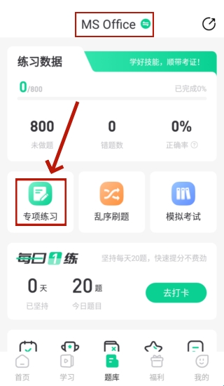 2、在界面上方切换您需要刷题的类型,这里以计算机二级MSOffice为例,接着点击“专项练习”。