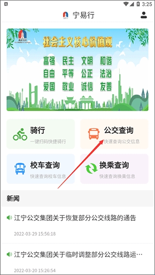 1、通过本站下载宁易行app并打开,进入软件后,我们可以扫码骑行共享单车,还可以查询公交、换乘、校车信息等等,以公交查询为例;