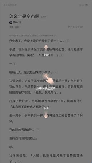 3、阅读界面的手指操作也很简单,上划看下一页内容,下滑则返回上一页,轻触中间部分即可唤起菜单