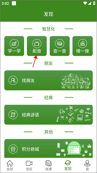 1、打开bbe英语听力,进入“发现”页面,点击“配音”
