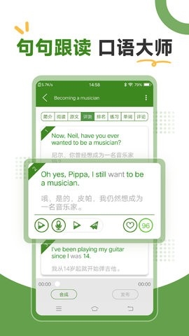 3、通过智能语音技术自动对发音水平进行评价、定位发音错误、发音缺陷.来测一测你能得100分吗。