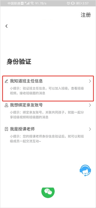 2、如果是新用户,请先完成注册,并根据提示绑定所属班级和学生信息。