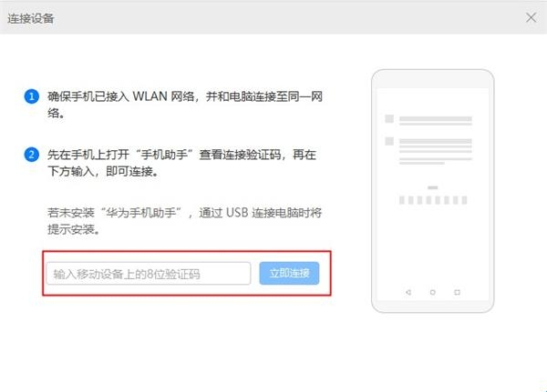 先在手机上打开“手机助手”查看连接验证码,再在下方输入,即可连接。
