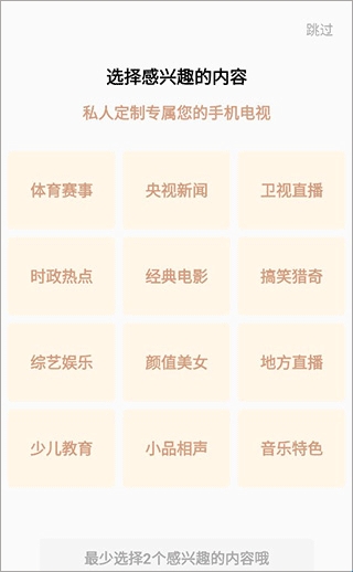 用户在本站下载并打开软件之后就会跳转到爱好选择页面,可以选择自己喜欢观看的内容,也可以点击右上角跳过。