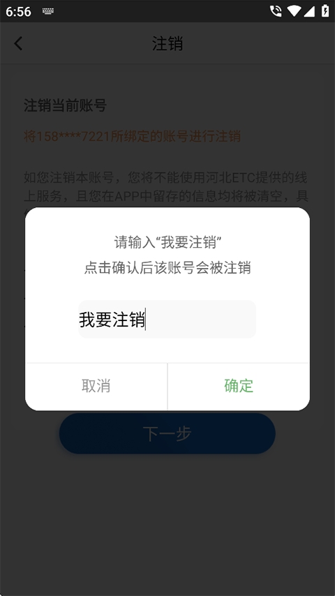 5、输入我要注销,并点击确定,接着输入手机验证码完成注销;