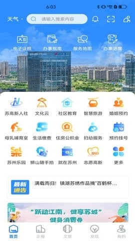 苏新惠APP是针对苏州高新区提供的一款政务服务软件,覆盖的功能范围十分的广泛,文体教育、医疗健康、交通出行、企业服务、旅游休闲、民生政务服务等,为当地居民用户提供一站式的服务帮助,随时查询办事进度,一些最新的政策以及资讯也是可以及时了解的,为本地用户的生活提供了极大地便利。