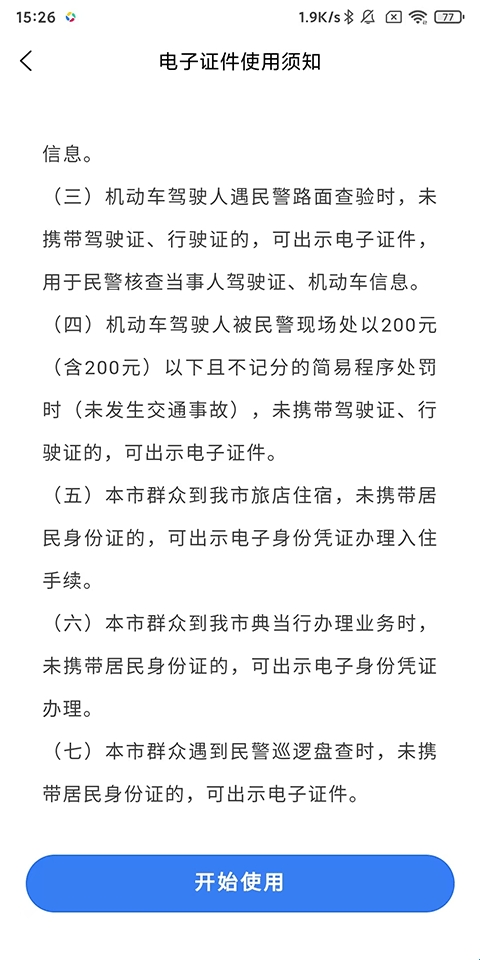 2、阅读电子证件使用须知并点击下方【开始使用】;