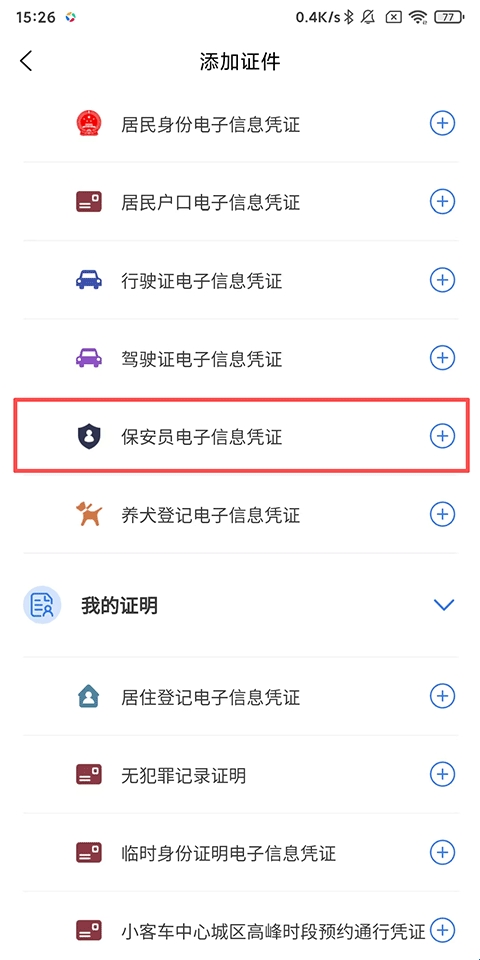 4、找到保安员电子信息凭证,点击右侧的【+】即可查询已有保安证。