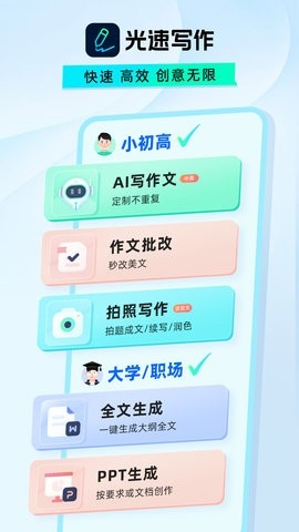 光速写作是一款专为学生和职场人士打造的智能写作工具。能够满足用户在学习,工作和生活中的各种写作需求,对于中小学生来说可以轻松生成作文,有丰富的素材可以学习和参考,支持进行作文批改,对于大学生和职场人士来说可以生成ppt,超多模板可选,各种场景从容应对!