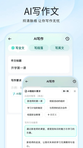 ●智能写思路:输入作文题目,我们的智能会为您生成多种写作思路,帮助您打开创作灵感。