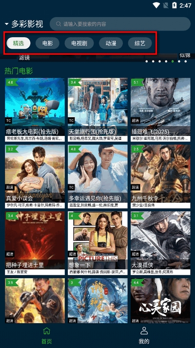 1、打开软件进入首页,上方有多种类型影视可以观看