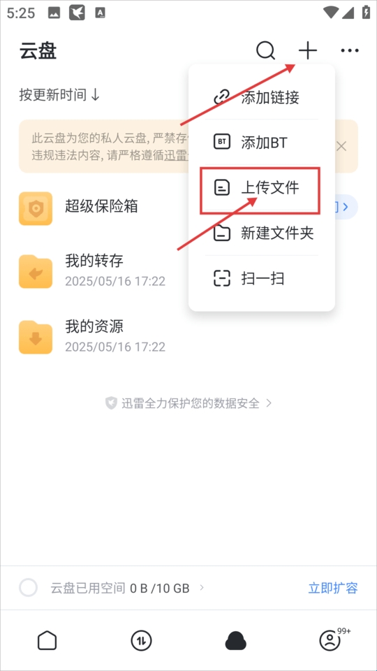 3、点击右上方加号,并点击上传文件。