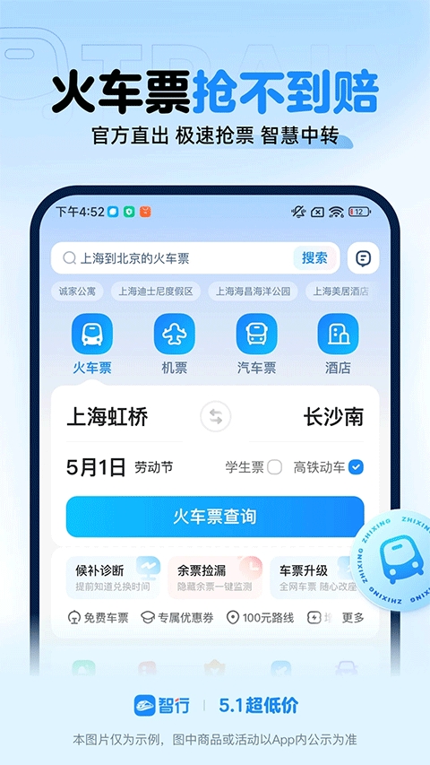 智行火车票APP提供了一站式的抢票服务,除了能够在上面购买动车、高铁票之外,买火车票、飞机票、船票也是可以的。会帮助大家实时监控剩余票,加入抢票列表还能自动帮你抢票。各项票务信息都很详细,能让你合理安排出行。全国各地特惠酒店也有,需要住酒店的用户能随时在线查看预定。