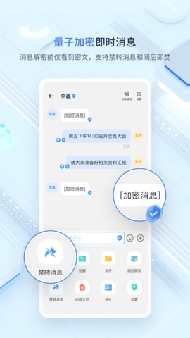 中移量子密讯app官网版是一款功能强大的加密通信交流应用软件,软件会对用户的即时信息在线进行加密,能够一键实现安全的办公,方便用户可以进行加密聊天,随时传输自己的聊天消息,就可以实现多类型的端到端的加密,对用户的信息安全在线进行防护,避免信息外泄。平台还支持用户可以在线进行加密的音视频通话,用户可以随时进行量子加密保护,快速发起自己的安全通话,轻松高效的进行交流。此外,中移量子密讯最需还支持用户可以对企业的组织架构信息进行查看,在线查询企业的通讯录,随时进行沟通,有需要的用户就赶紧来本站下载使用吧!