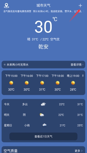 2、在首页右上角找到"+"号按钮,点击进入城市管理页面。