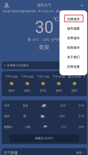 3、选择"切换城市"功能,浏览或搜索需要查看天气的目标城市。
