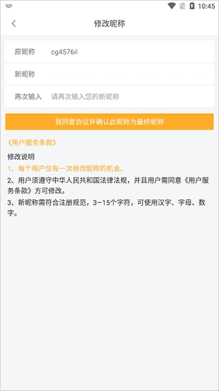 5、进入修改昵称界面后,输入新的昵称,点击同意协议,完成昵称修改;