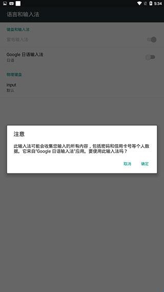 2、打开Google日语输入法右侧的开关,如果弹出注意事项,点击【确定】即可。