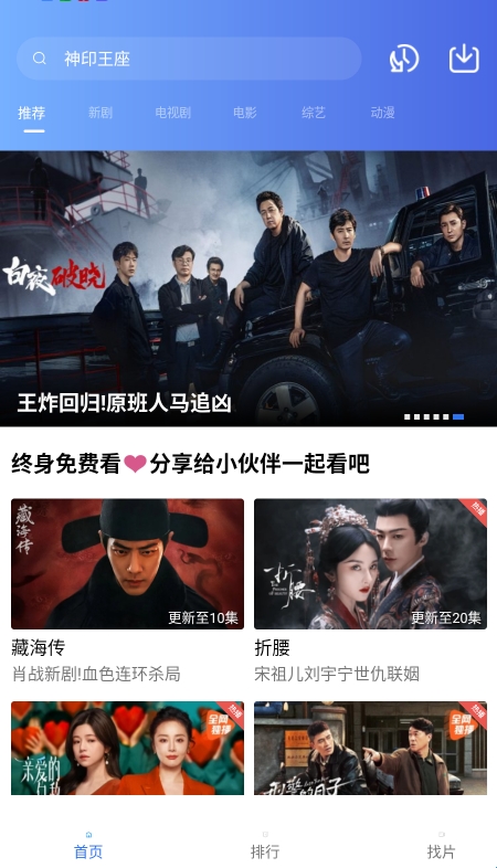 蓝天视频是一款页面简单并且不需要会员的追剧软件。软件为用户提供了海量的影视内容,支持用户免费的观看全网热播新剧资源,国内外不同类型的电视剧、电影、综艺等资源全部都有收录,能够很好的满足用户对于追剧的不同需求,同时,软件内还可以进行一键投屏功能,轻松将手机上的影视投屏到电视上。