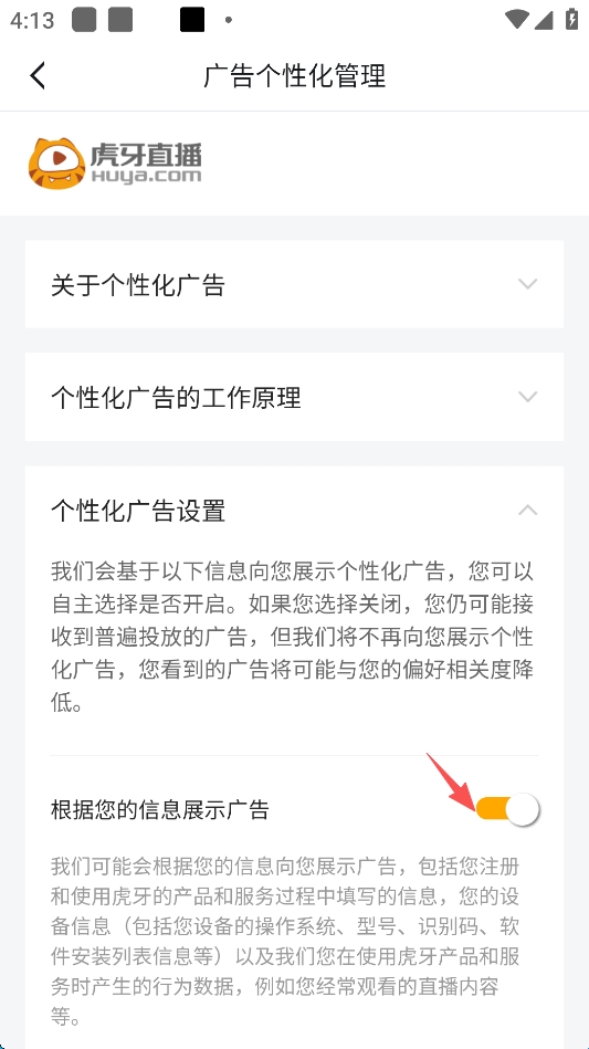 7、同样点击“根据您的信息展示广告”右侧的“开关键”,将该功能关闭。