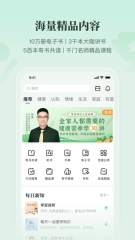 有书是一款能够丰富日常生活的学习阅读软件。在这个繁忙的生活中,我们很久都没有认真读完一本书了,这款软件可以帮助用户制定读书计划,设置自己的读书阅读时间,每天坚持,软件非常的纯净,页面很清爽,收录了海量的优质书籍资源供用户选择阅读,经典的书籍资源也都有提供。