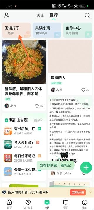 2、接着点击社区这里可以看到一些人发的内容,点击阅读搭子