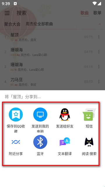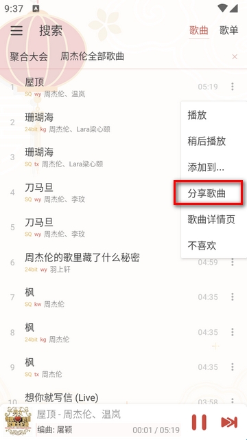 3、在得出的歌曲中点右侧的三个点选择分享。