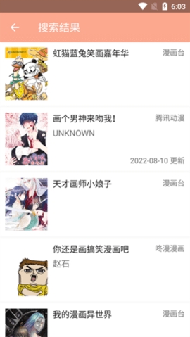 2、自由搜索喜欢的漫画作品,通过漫画名、作者名或者关键字进行搜索,快速找到自己想看的漫画;