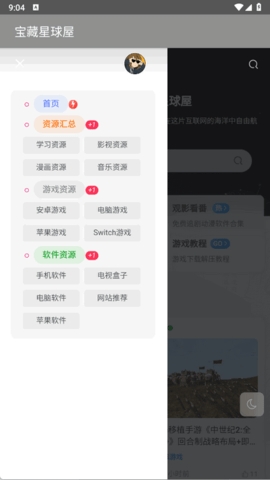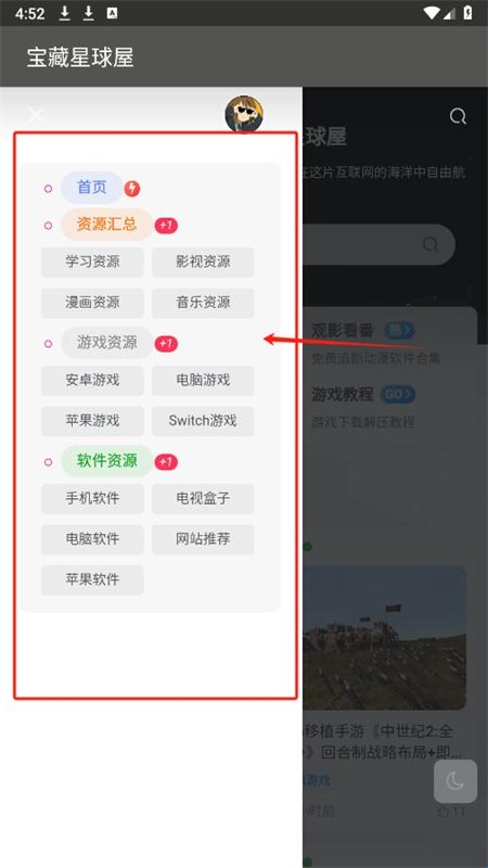 2、点击左上角三个横杠按钮,进入导航菜单页面,可以根据资源分类来选择