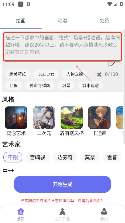 进入app,用户可以输入自己的文字描述自己想象中的图片