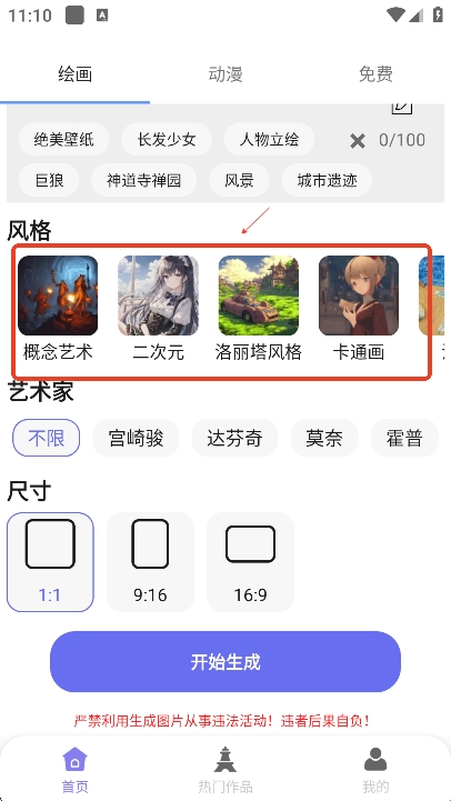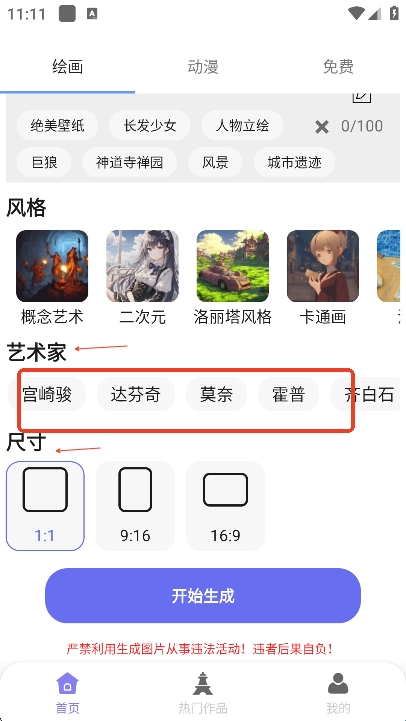 然后选择自己图片的艺术家风格和尺寸,最后点击”开始生成“,就可以得到AI生成的图片啦