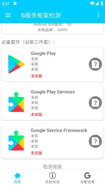 3.一键扫描自动检测设备上的Google服务框架是否完整,且为最新版本。