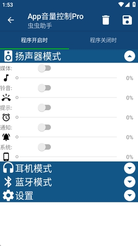 一款专门为安卓手机用户打造的便捷音量控制软件——App音量控制Pro专业版(App Volume Control Pro),软件拥有多种不同的模式可以选择,用户可以根据不同的应用程序来选择调节开启应用时的音量及关闭应用时的音量,包括媒体、铃音、提示、通知、系统等,满足用户的个性化使用需求。
