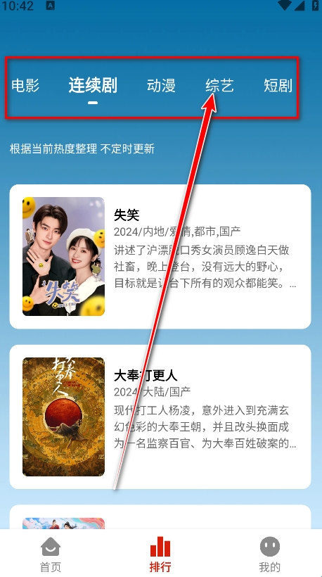 3、可以看到根据当前热度整理不定时更新的电影、连续剧、动漫、综艺、短剧排行榜榜单,大家想看哪个就点击哪个,比如小编点击综艺。
