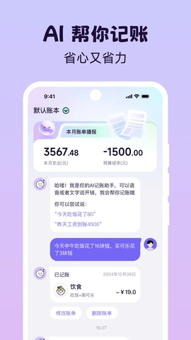 1、支持通过语音或文字的对话式方式记录消费,只需说出消费信息,就能自动解析金额、时间和类别。