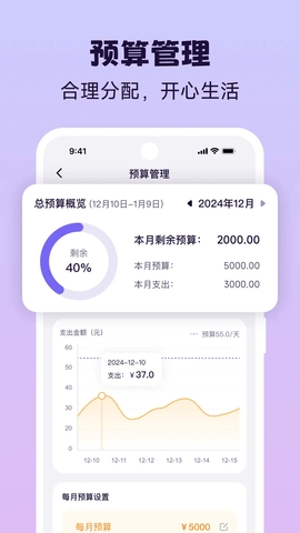 2、设定每月预算,查看总预算概览和每日预算使用情况,实时跟踪预算剩余比例,帮助合理分配资金。