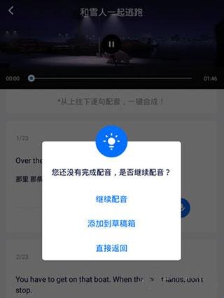 2、如果你想要退出并删除合配,只需点击左上角的“返回”选项,选择其中的“直接返回”即可删除正在录制的合配配音,如下图所示: