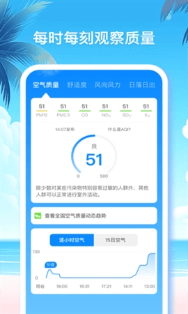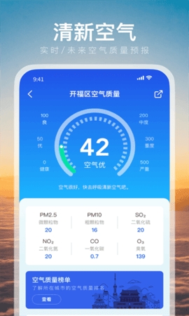 2、监测并展示空气质量信息,帮助用户关注生活健康,特别是在沙尘天气等特殊时期。