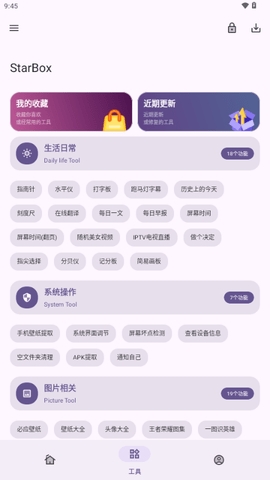 StarBox工具箱(StarBox)又名:星盒:功能多多且完全免费的工具箱软件。软件中的功能覆盖了很多的方面,系统操作、生活日常、图片相关、壁纸大全、音频解析、短视频解析等,全部的功能都可以直接的使用,可以有效的提高用户的生活和工作效率,感兴趣的用户快来下载吧。