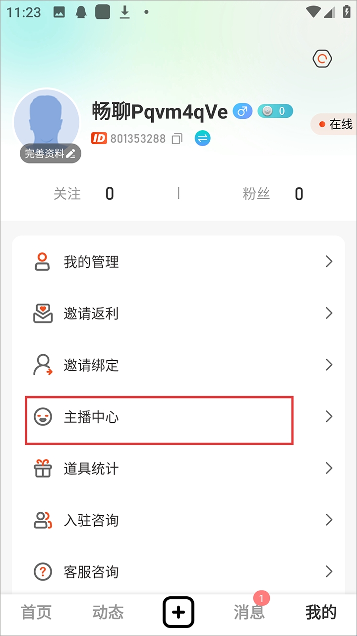 2、接着下滑找到主播中心并点击。