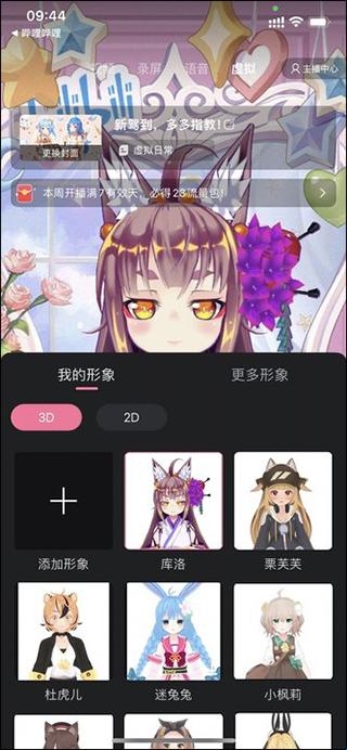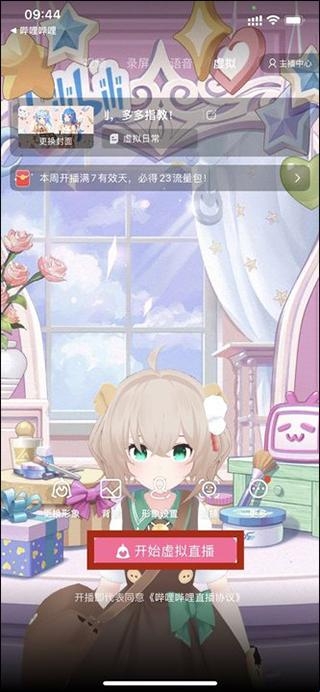 1、在哔哩哔哩直播姬app的主界面上点击“开始虚拟直播”或是想换形象的话可以点击“更换形象”;
